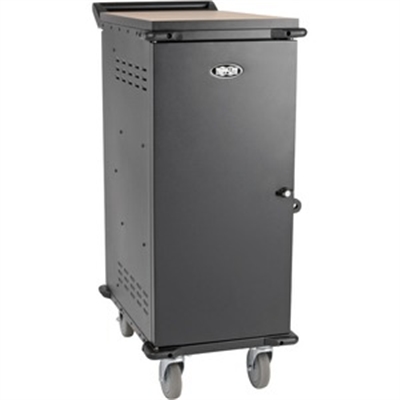 AC Charging Cart Storage Station. Compact Mobile Charging Station Accommodates up to 27 Chromebooks and Laptops This 120V multi-charging station provides AC charging secure storage and cord management for as many as 27 Chromebooks and laptops with a screen size up to 15 inches. The connected devices AC adapters plug into 27 NEMA 5-15R outlets for charging. A built-in circuit breaker protects the devices against overloads. The laptop charging station is recommended for classrooms businesses medical facilities government agencies and anywhere else that uses mobile devices on a daily basis. Locking Steel Enclosure Keeps Valuable Equipment Safe and Secure Constructed from heavy-duty steel covered with a black powder-coated finish this charging cart provides safe secure storage. Devices and their power adapters are stored in separate compartments. The front and back doors lock with the included keys to help prevent theft damage and tampering. For extra security the front door can be fastened with a user-supplied padlock. Flow-through ventilation helps protect against overheating and the specially coated shelves help prevent device scratches and scuffs. Moving Your Devices from Room to Room Is Easy Large swivel casters with non-marking wheels improve the ride over uneven surfaces including carpeting and thresholds and lock to help prevent unwanted movement. The reversible wide-grip handle makes the cart easy to control. Corner safety bumpers protect walls and doorways from scratches. The compact Chromebook charging cart takes up about the same amount of physical space or even less as a typical A/V cart. Well-Organized to Avoid Confusing Cable Clutter Heavy power adapters store out of the way in removable baskets. Cables and connectors run through zoned slots and an overhead cable manager keeping them organized and out of the way. Adjustable dividers accommodate up to nine devices per shelf and device spaces are numbered for easy identification. A power cord wrap keeps the input cord out of the way when moving the charging station. The 10-foot cord with space-saving right-angle NEMA 5-15P plug allows great flexibility in reaching AC outlets. Laminated Wood-Grain Top Doubles as a Convenient Workstation The laminated top acts as a smooth writing surface and holds a projector monitor or other peripherals. A pass-through RJ45 jack is provided for connecting Ethernet devices such as a wireless router or hotspot inside the cabinet.