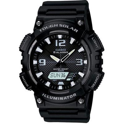 CASIO ANA-DIGI SOLAR WATCH. Black resin band solar digital analog watch with black & white face. Utilizing a unique Self-Charging solar power system this sporty analog/digital combination model provides plenty of functionality. A host of features such as 48-city world time 5 alarms stopwatch and dual countdown timers make this a versatile timepiece for almost any sport outing. 100M water resistant.