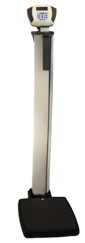 Features 1″ LCD display with digital, integral height rod that measures 24″ – 88″ (61cm – 223cm). Has LB/KG conversion, LB/KG Lock Out, Body Mass Index (BMI), Zero Out, Pre-Tare, Recall & Reweigh, Hold/Release, Auto Zero and Auto Off functions. The design feature includes 2-wheels for ease of movement. It electronically gathers height, weight and BMI. Comes with a 2-year warranty.