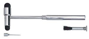 Chrome-plated octagonal handle with compartment to house stainless steel needle and brush. Black rubber bumper.