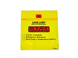 Specimen Bag, Seal-N-Rip, Removable Biohazard Symbol, Zipper Closure, 3-Wall, Yellow Tint Printed “STAT” in English and Spanish, 1.75 mil, 6″ x 9″, 100 bg/pk, 10 pk/cs