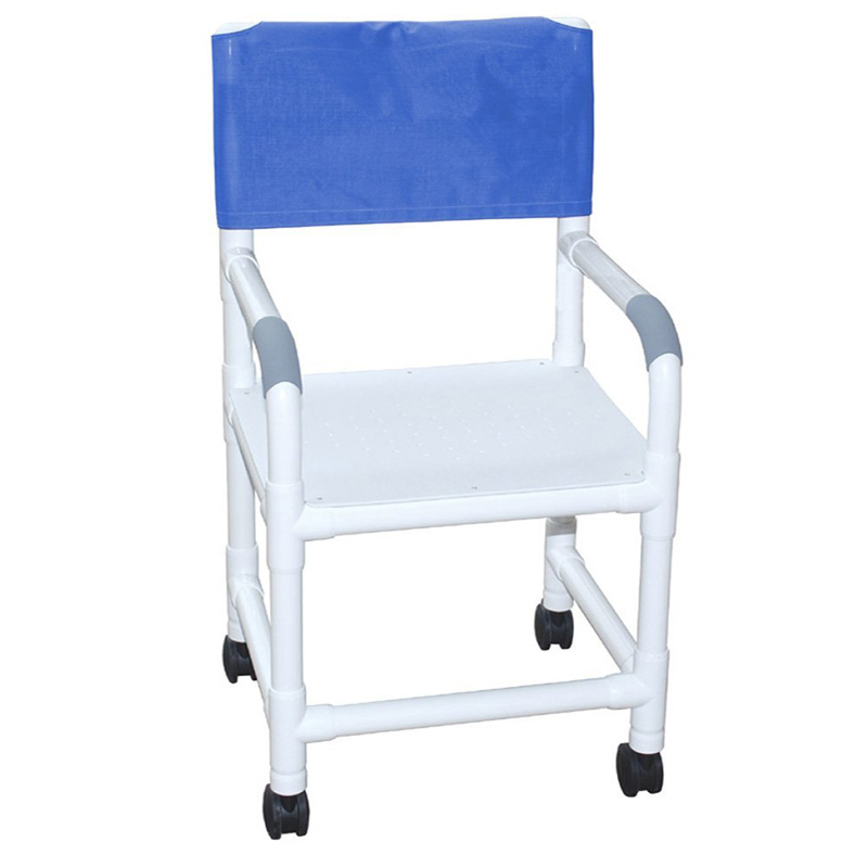 Shower chair 18″ internal width, 3″rust proof threaded stem casters, flatstock seat w/ drain holes 300 lbs wt cap