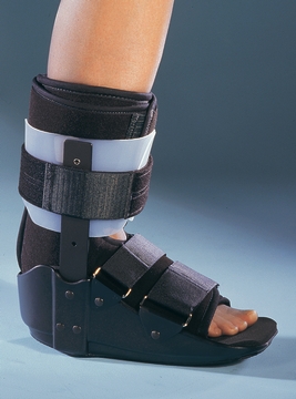 Shorter uprights and circumferential plastic shell restricts foot and ankle motion. Provides comfortable stability for acute ankle sprains, soft tissue injuries, stress and stable fractures of the foot. Fiber/nylon liner with heel pads for added patient comfort.