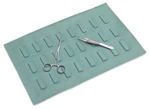 These disposable magnetic drapes and safety products are specifically designed to attract and hold surgical instrument son the sterile field. These products help minimize the risk of percutaneous injuries. They provide for safe, effective instrument transfer in the operating room. Patented “stays” can be shaped to form a “safety trough” along the edges. The kidney shaped basins and rectangular trays attach easily to the drapes. Flexible drapes with non-slip foam backing. Raised magnets.